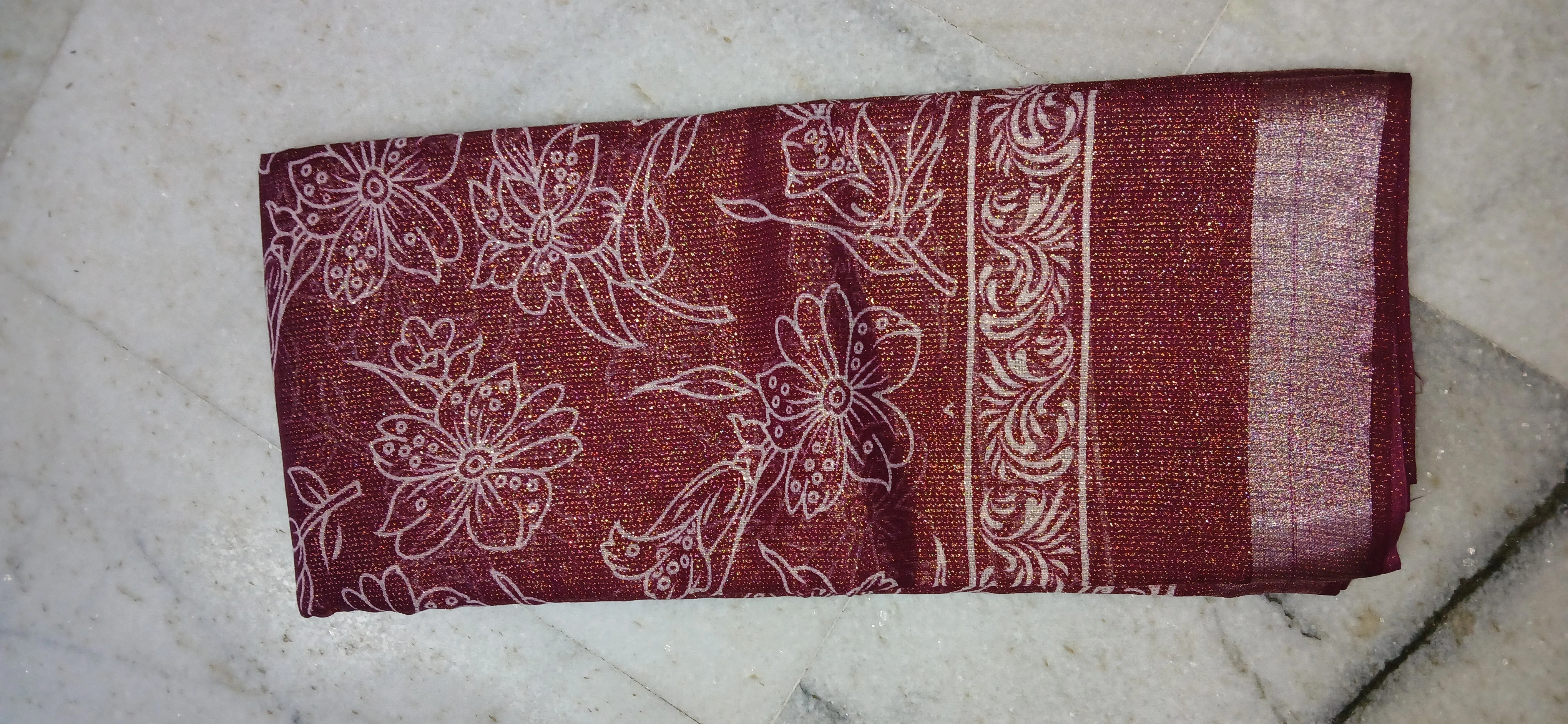 Elegant Maroon Shimmer Floral Printed Saree with Zari Border