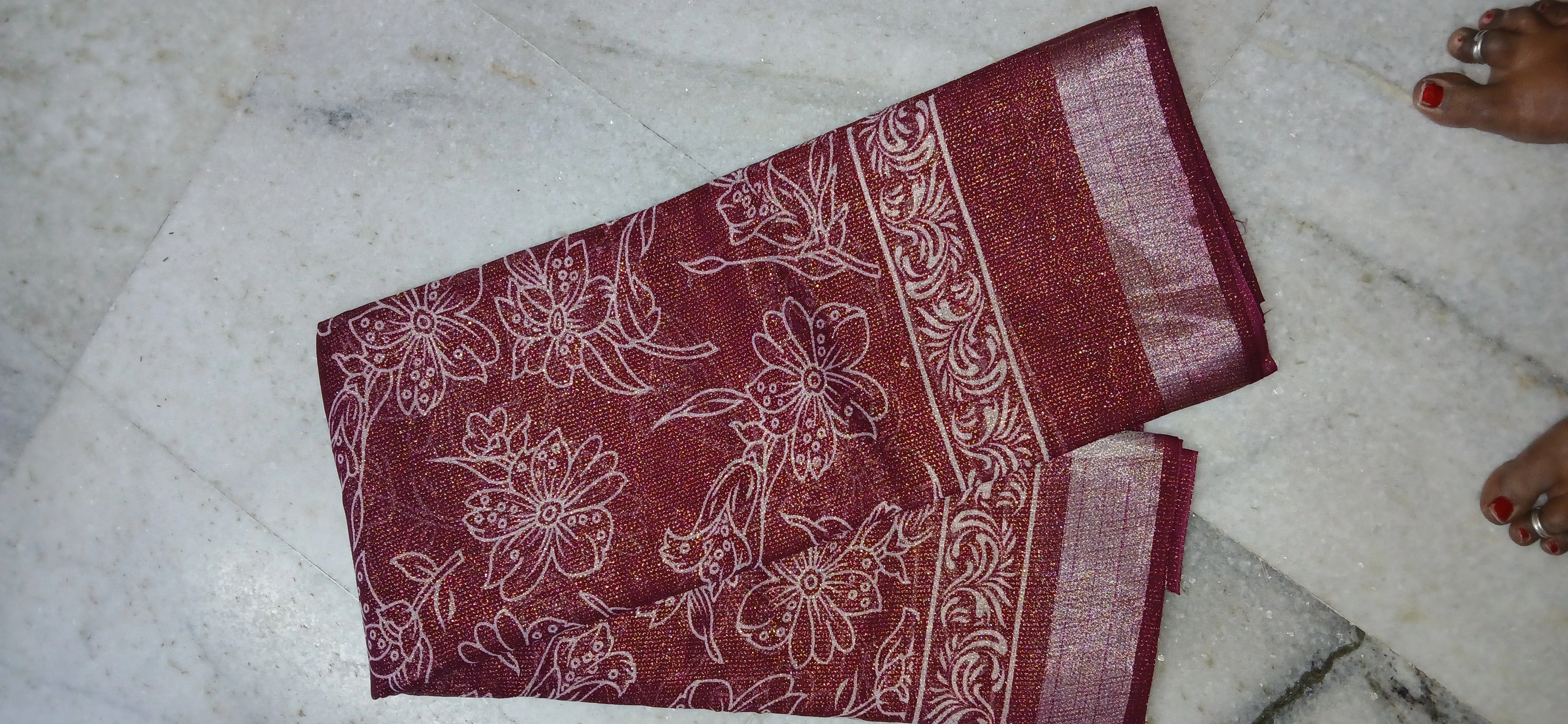Add a touch of elegance to your wardrobe with this beautiful maroon shimmer saree. Crafted with a soft, lightweight fabric, it features graceful floral and swirl prints highlighted with a subtle shimmer finish. The shimmering zari border enhances its festive appeal, making it ideal for weddings, parties, festive celebrations, and evening functions. Easy to drape and comfortable for long wear, this saree blends traditional charm with modern style.