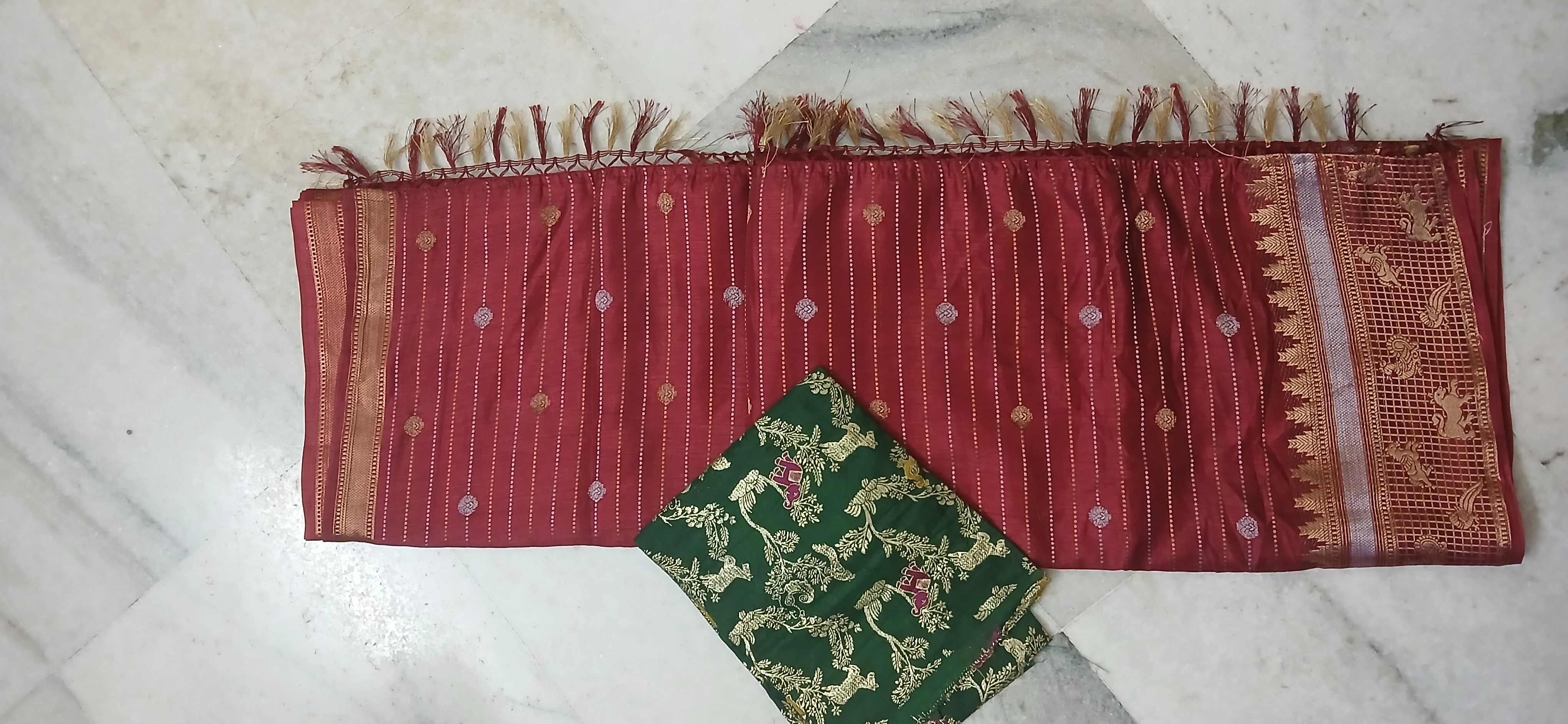 Elevate your ethnic wardrobe with this elegant maroon woven silk saree, crafted with fine horizontal zari lines and delicately placed gold buttas across the body. The saree features a richly detailed traditional border with intricate woven motifs inspired by classic heritage designs, finished with graceful tassels for a festive touch. Paired with a contrasting green blouse adorned with gold prints, this saree is perfect for weddings, festivals, poojas, and special celebrations, offering a timeless blend of tradition and sophistication.