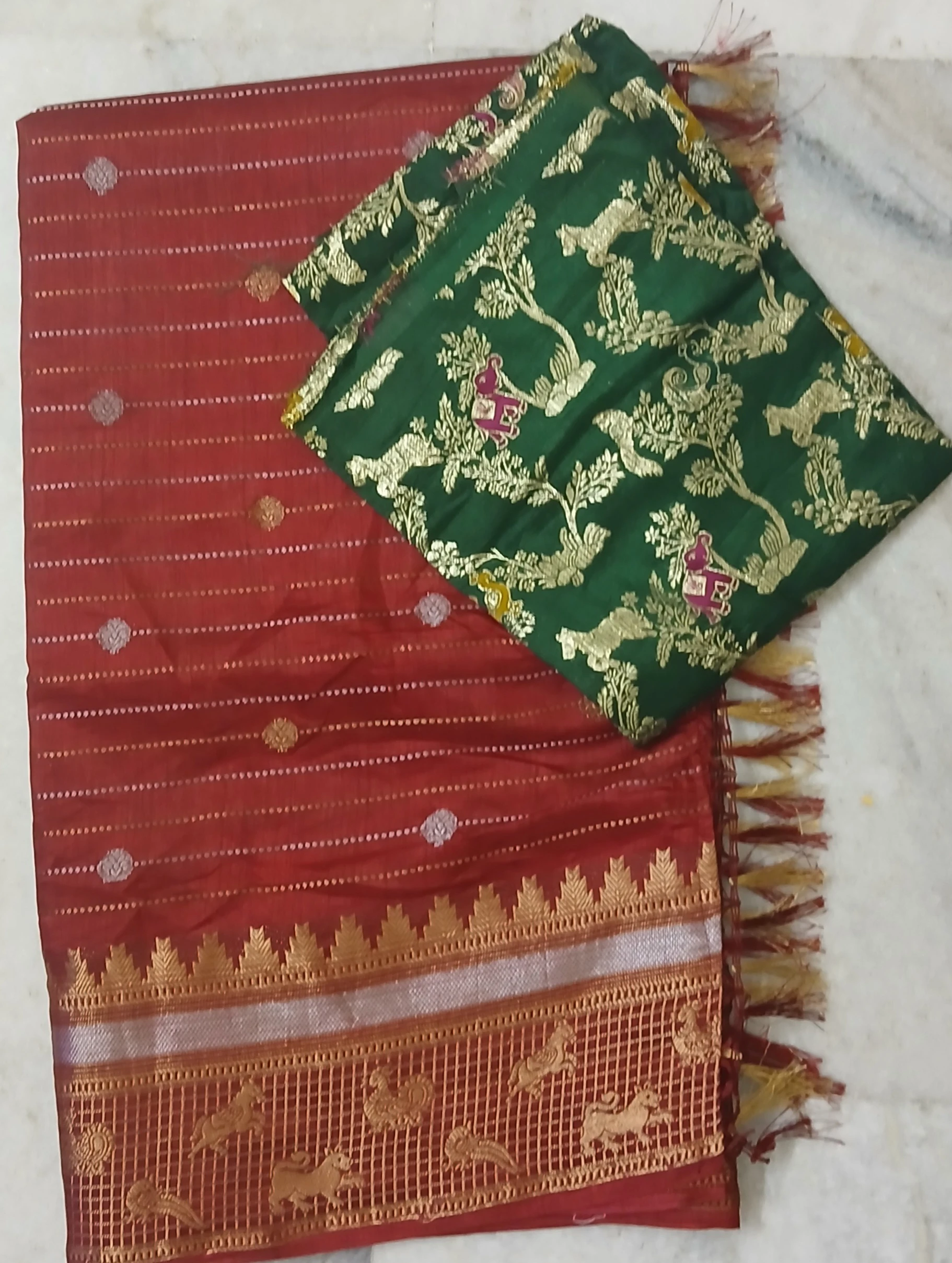 Maroon Heritage Woven Silk Saree with Contrast Green Blouse