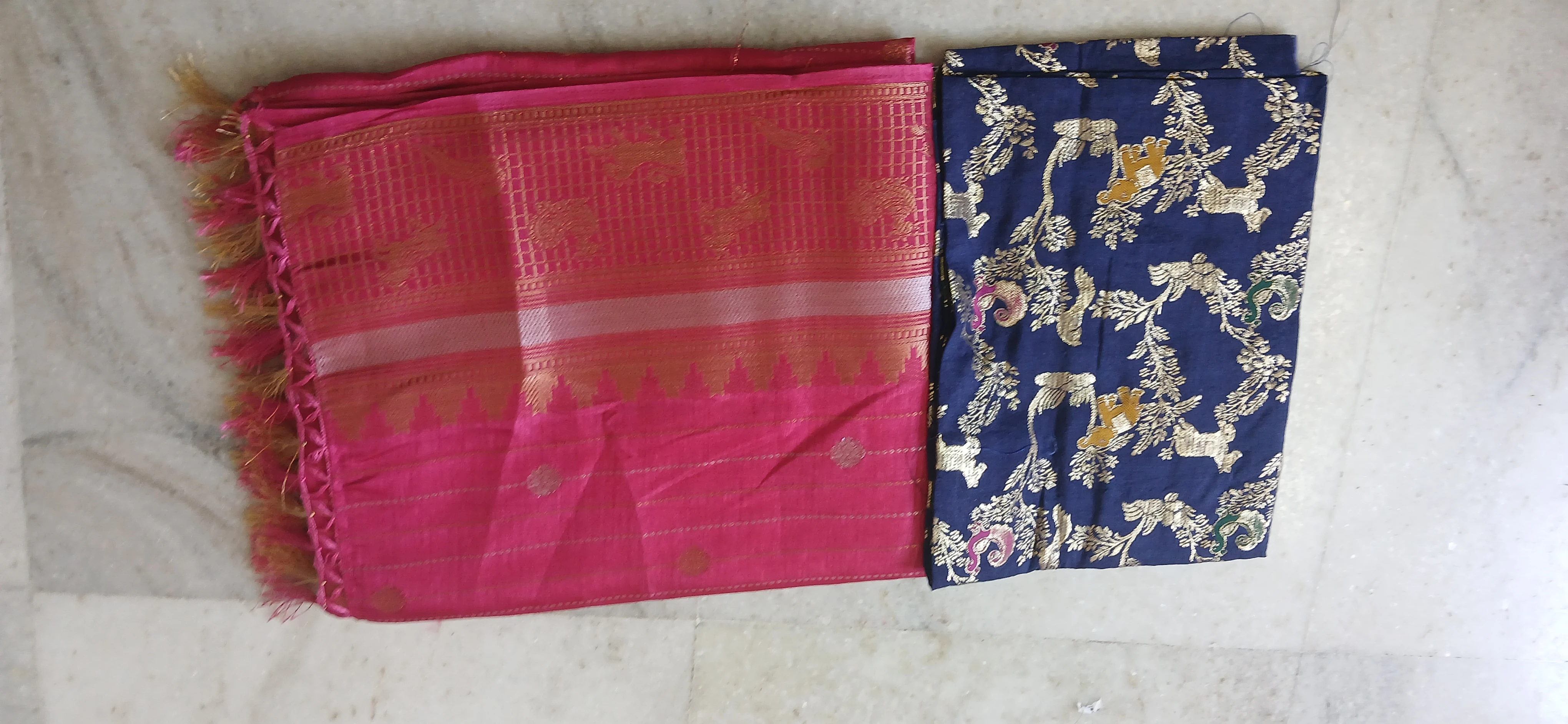 Teal Blue Zari Butta Silk Saree with Peacock Border & Magenta Blouse