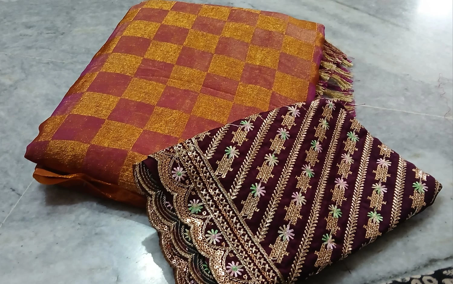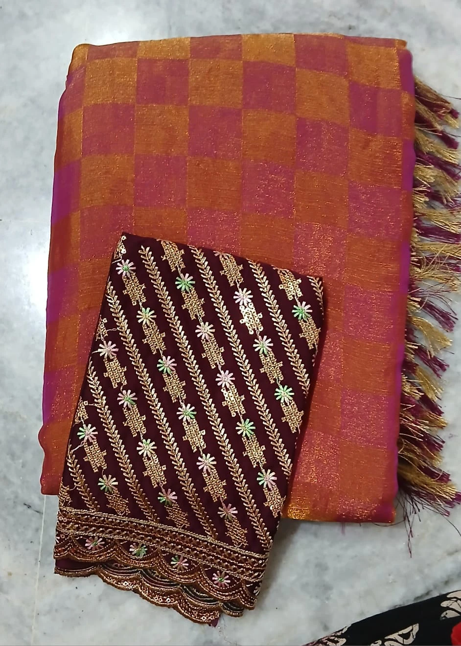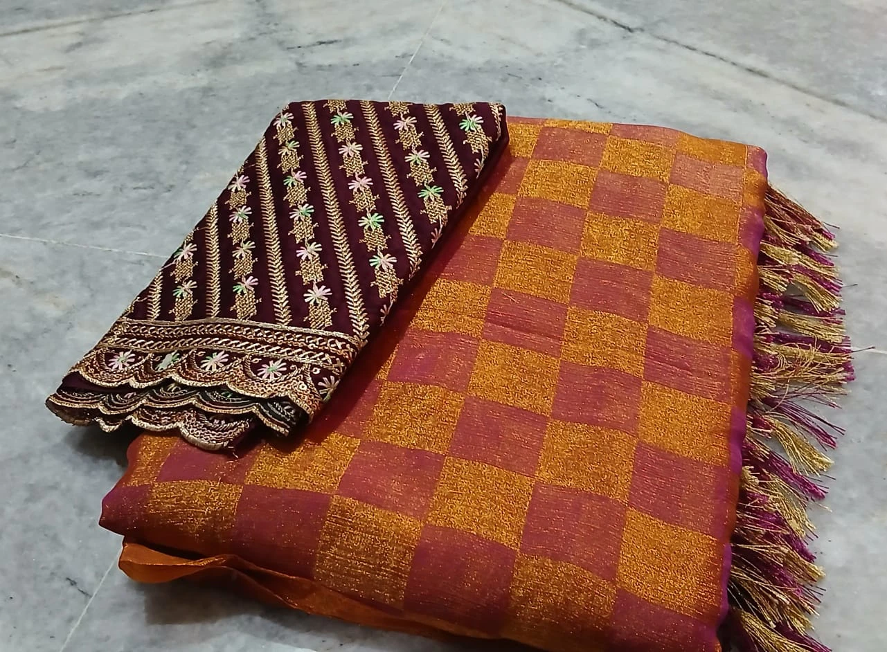 Grace meets tradition in this elegant rust orange and magenta checkered saree, beautifully woven with subtle zari shimmer. The saree features a rich texture with contrast magenta edging and stylish tassels on the pallu, adding a festive touch. Paired with a deep maroon blouse piece adorned with intricate golden embroidery and delicate floral motifs, this saree is perfect for weddings, festivals, and special occasions. A timeless choice for women who love classic weaves with a modern finish.