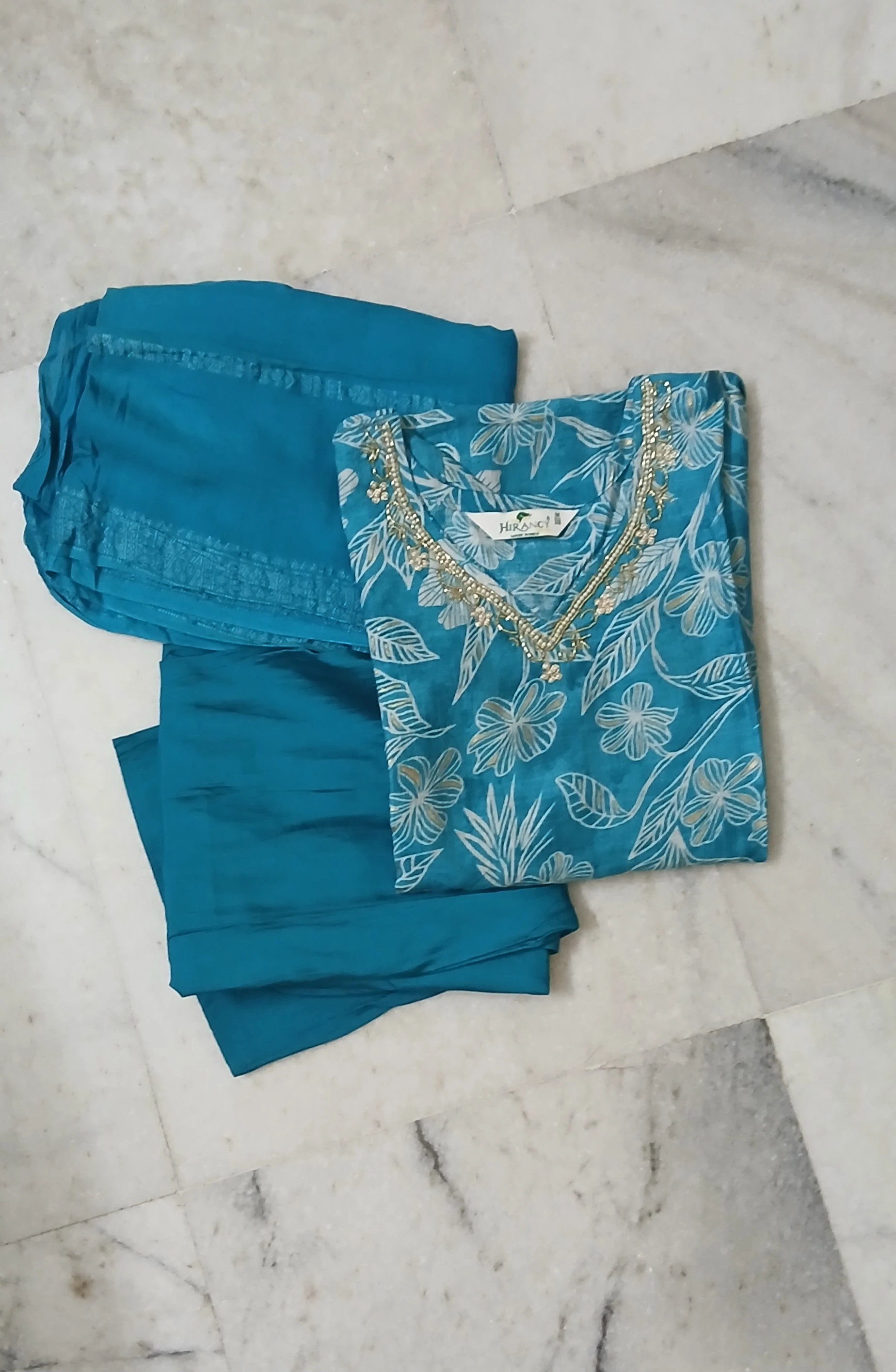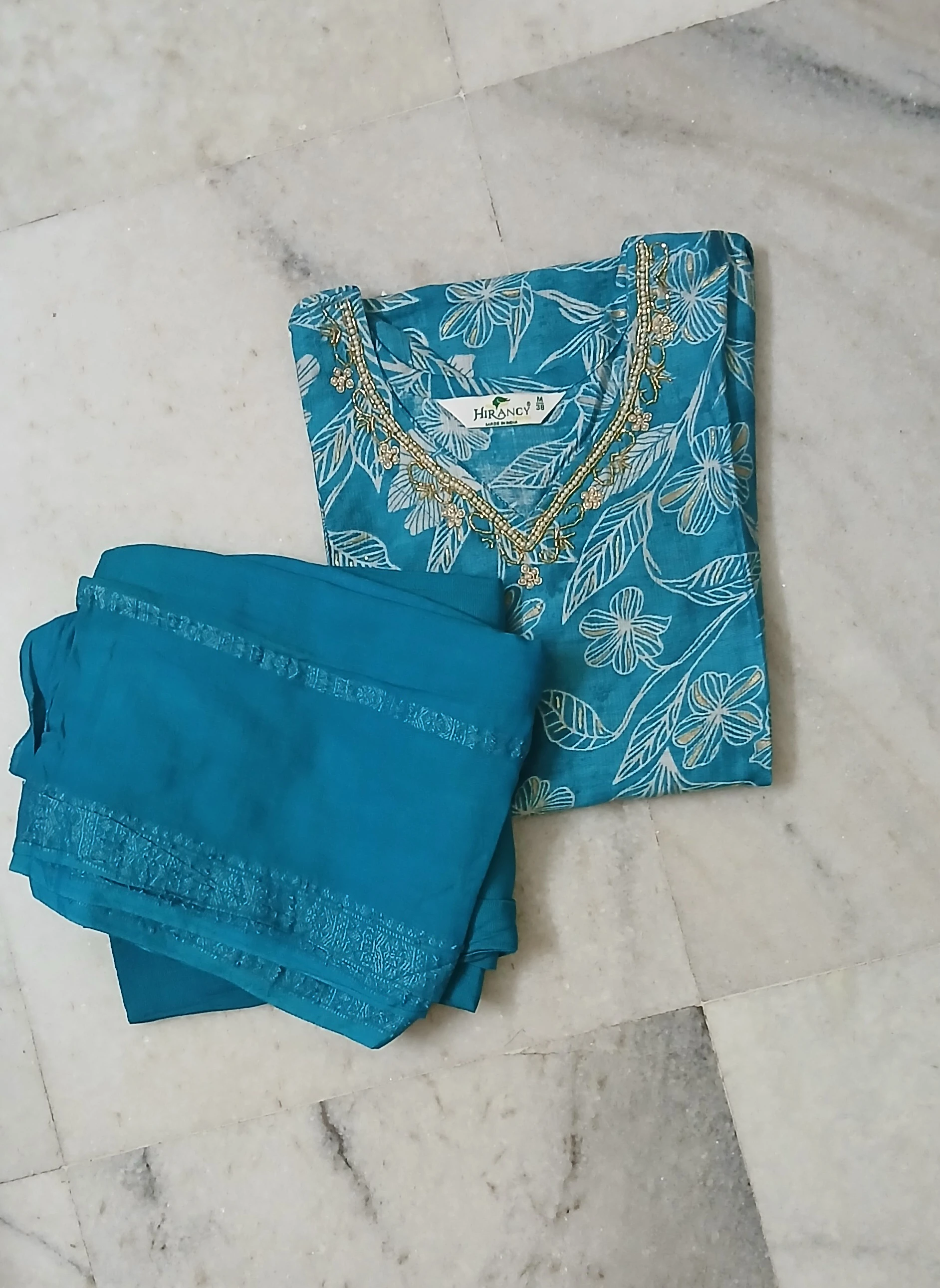 Enhance your ethnic style with this elegant teal blue floral printed kurti set, designed for both comfort and sophistication. The kurti features a graceful floral print complemented by delicate embroidery and bead detailing on the V-neckline, adding a subtle festive touch. Paired with a matching solid bottom and a lightweight coordinated dupatta, this set is perfect for office wear, festive occasions, casual outings, and family gatherings. Crafted from soft, breathable fabric, it ensures all-day comfort with a refined traditional look.
