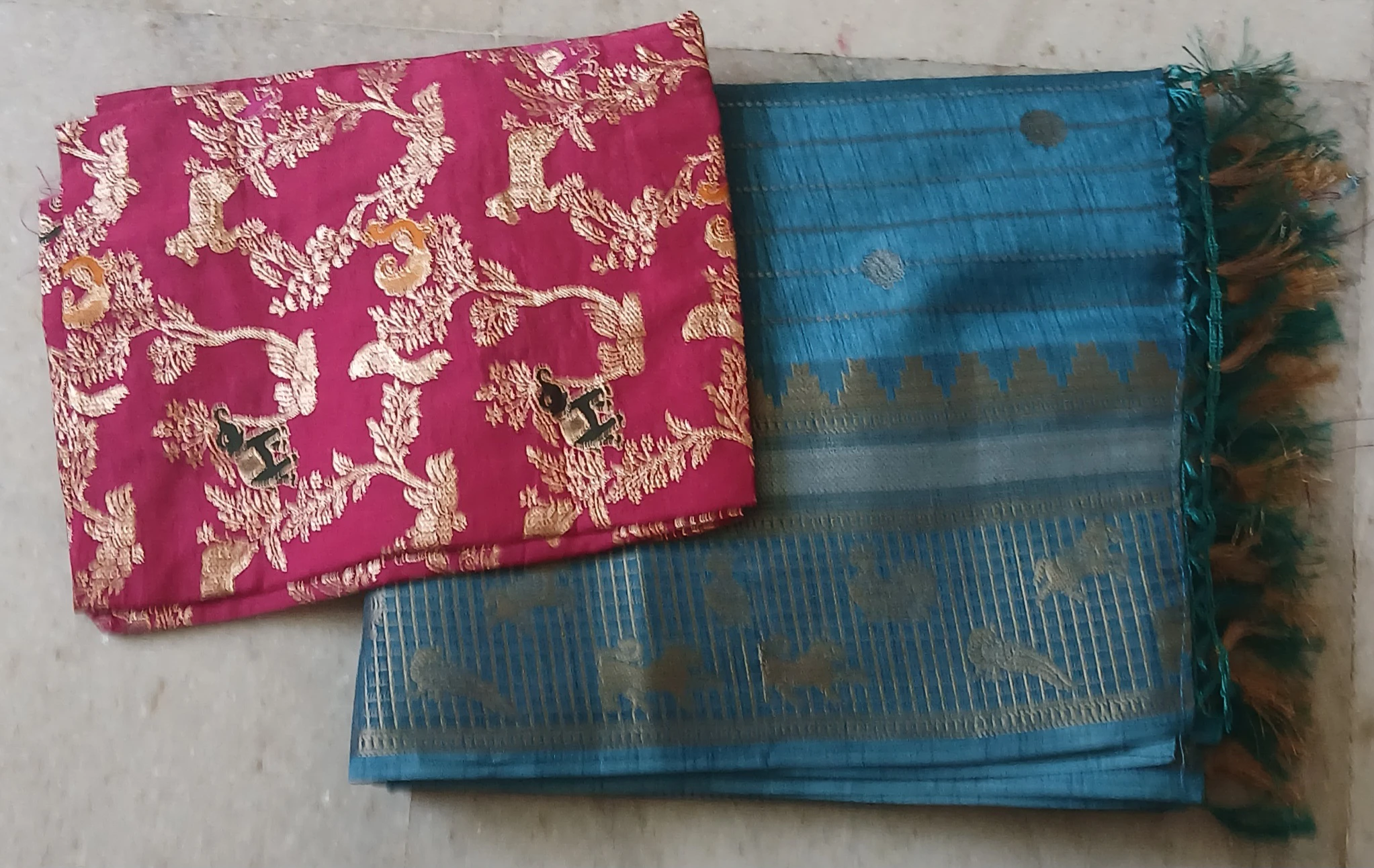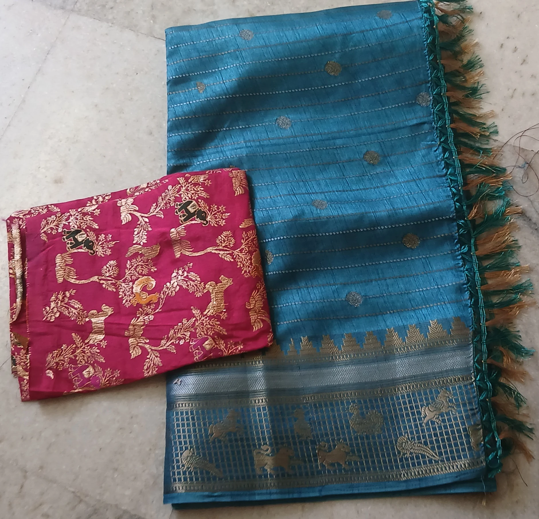 Elevate your ethnic wardrobe with this elegant teal blue silk saree, beautifully adorned with delicate zari buttas and fine horizontal weaving lines. The highlight of the saree is its rich zari border featuring traditional animal and peacock motifs, finished with stylish tassels on the pallu for a graceful festive look. Paired with a vibrant magenta blouse showcasing intricate gold animal and floral motifs, this saree is a perfect blend of tradition and charm—ideal for weddings, festivals, poojas, and special occasions.