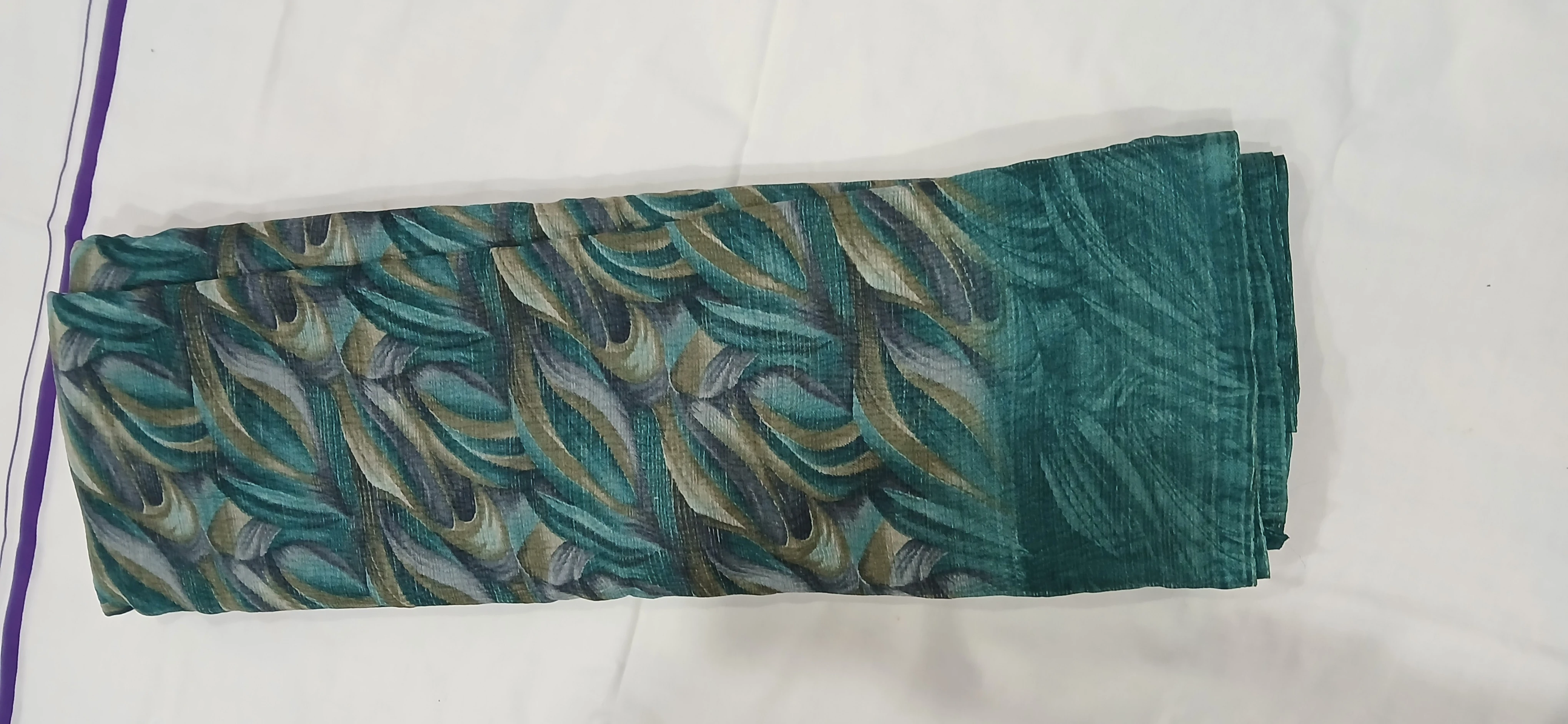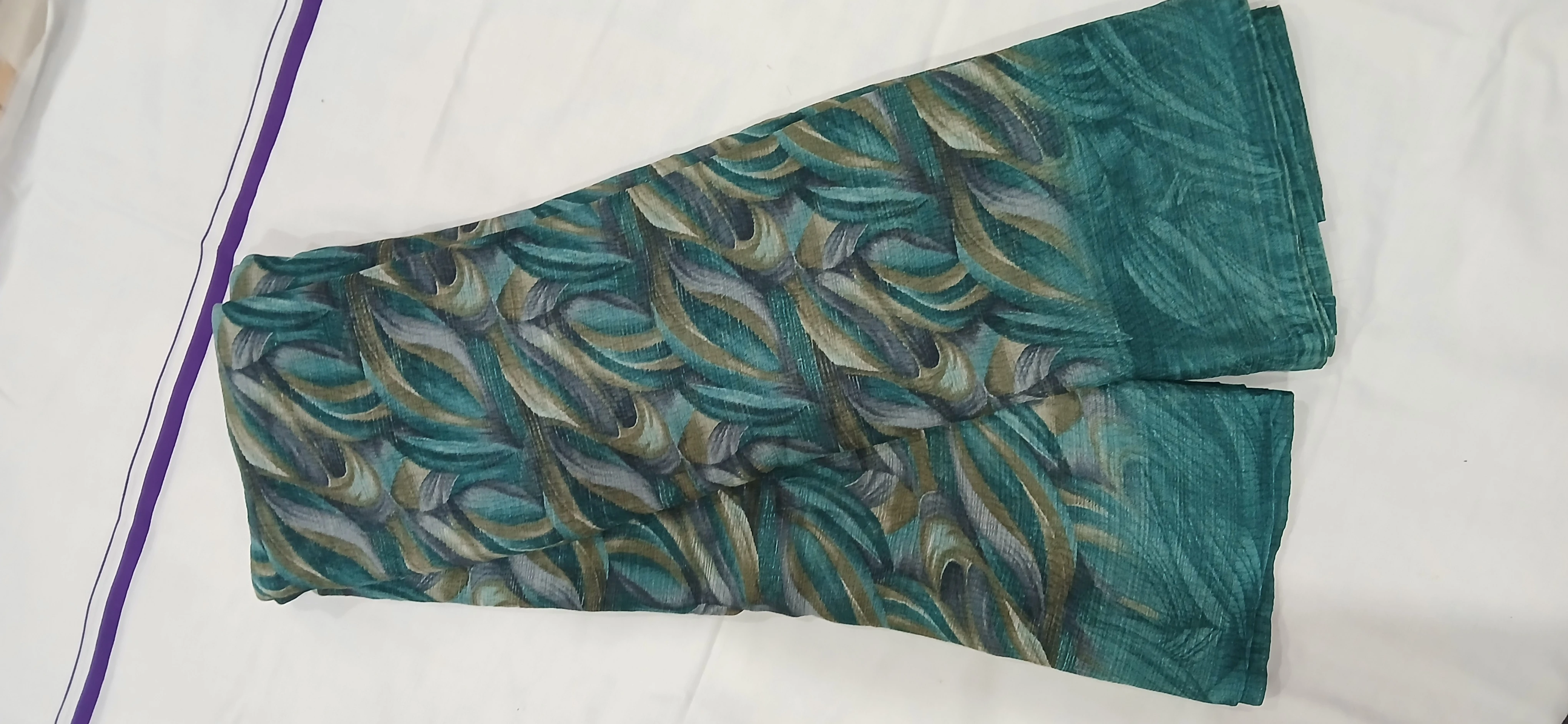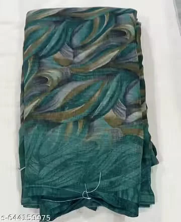 Elegant teal green chiffon saree featuring an artistic abstract leaf print in soothing shades. Lightweight and flowy, this saree offers a graceful drape and all-day comfort. Perfect for casual outings, office wear, or light festive occasions. Pair it with a solid blouse for a refined look.