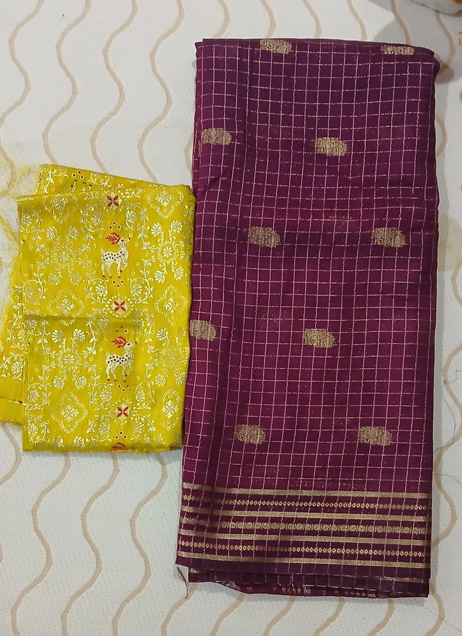 Enhance your ethnic wardrobe with this elegant wine purple traditional saree, featuring a classic gold zari checkered pattern and a rich floral zari border. The saree blends timeless tradition with everyday sophistication, making it perfect for festive occasions, weddings, poojas, and cultural events. Its graceful drape and shimmering zari work add a royal charm, while the deep wine color ensures a flattering look for all ages.