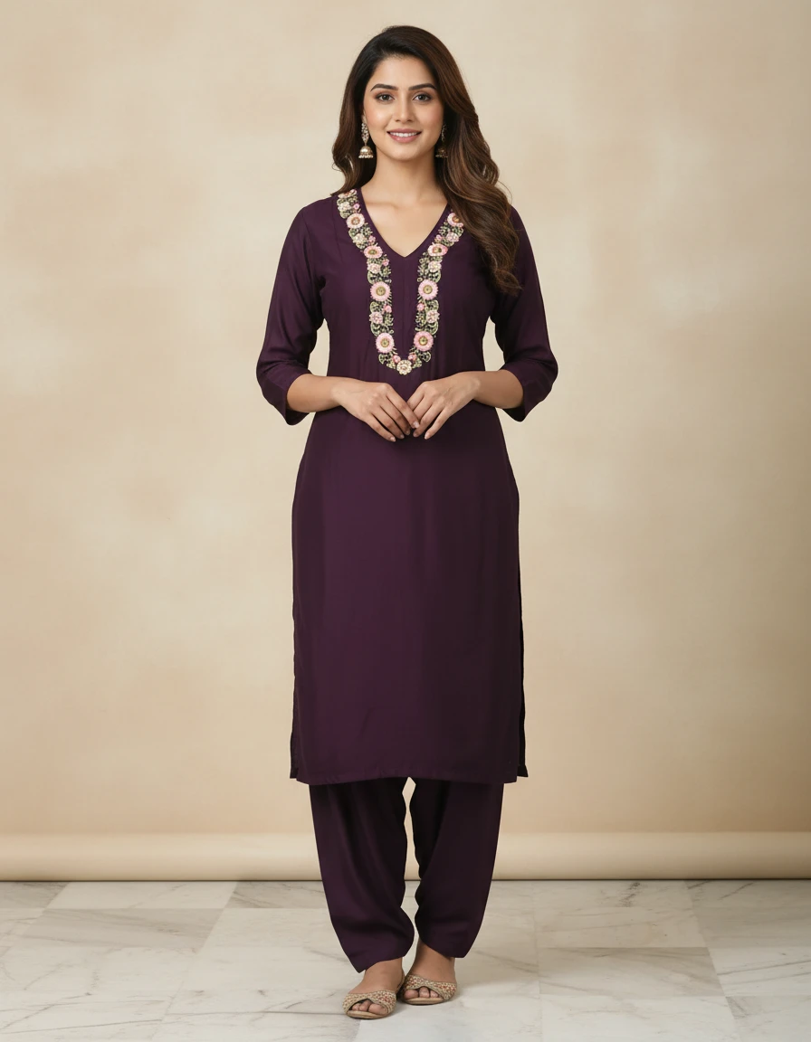 Add a touch of elegance to your ethnic collection with this rich wine purple embroidered kurti set. Featuring delicate floral embroidery on the kurti front panel, this set exudes timeless charm and sophistication. The solid-colored matching bottom and coordinated dupatta perfectly complement the kurti, creating a graceful and well-balanced look. Crafted from soft, comfortable fabric, this kurti set is ideal for festive occasions, office wear, family gatherings, and casual ethnic outings.