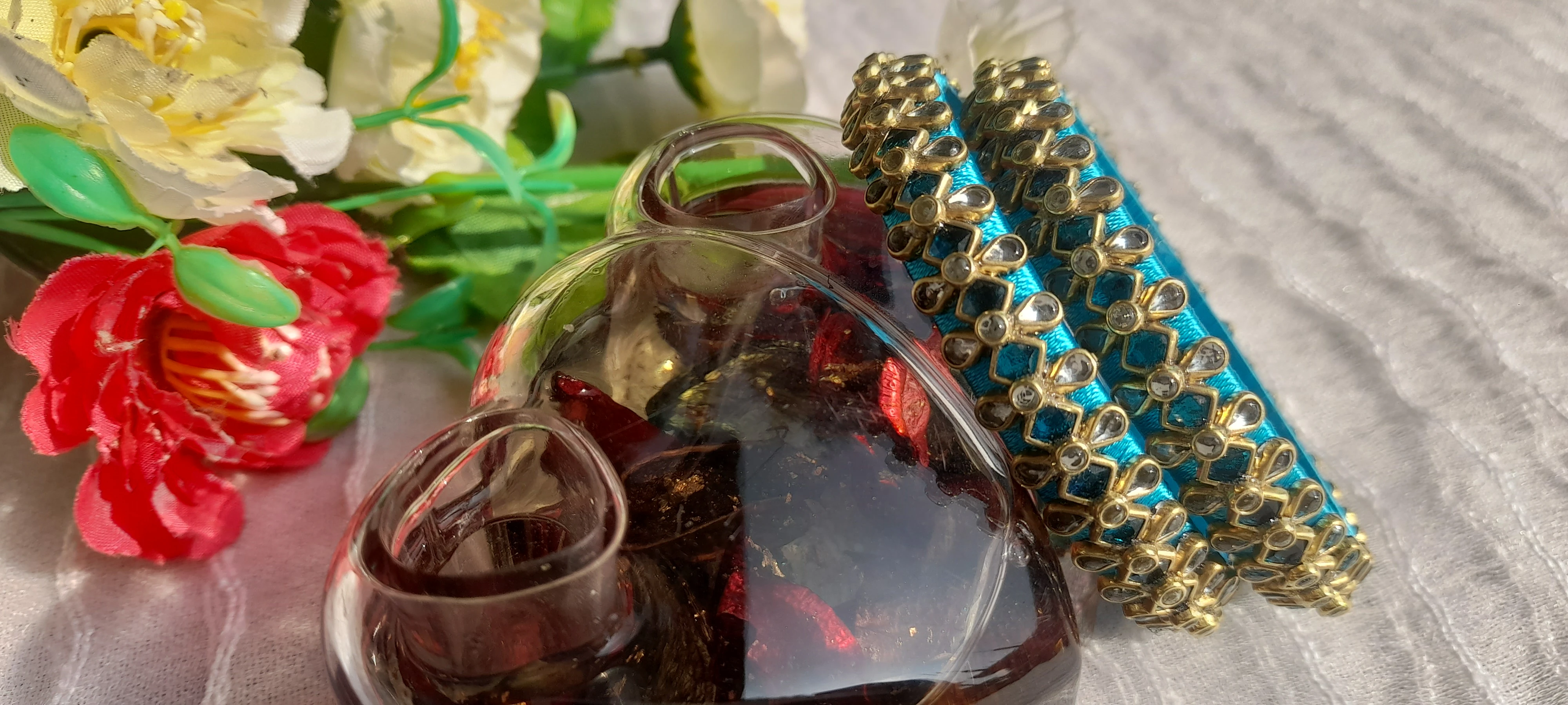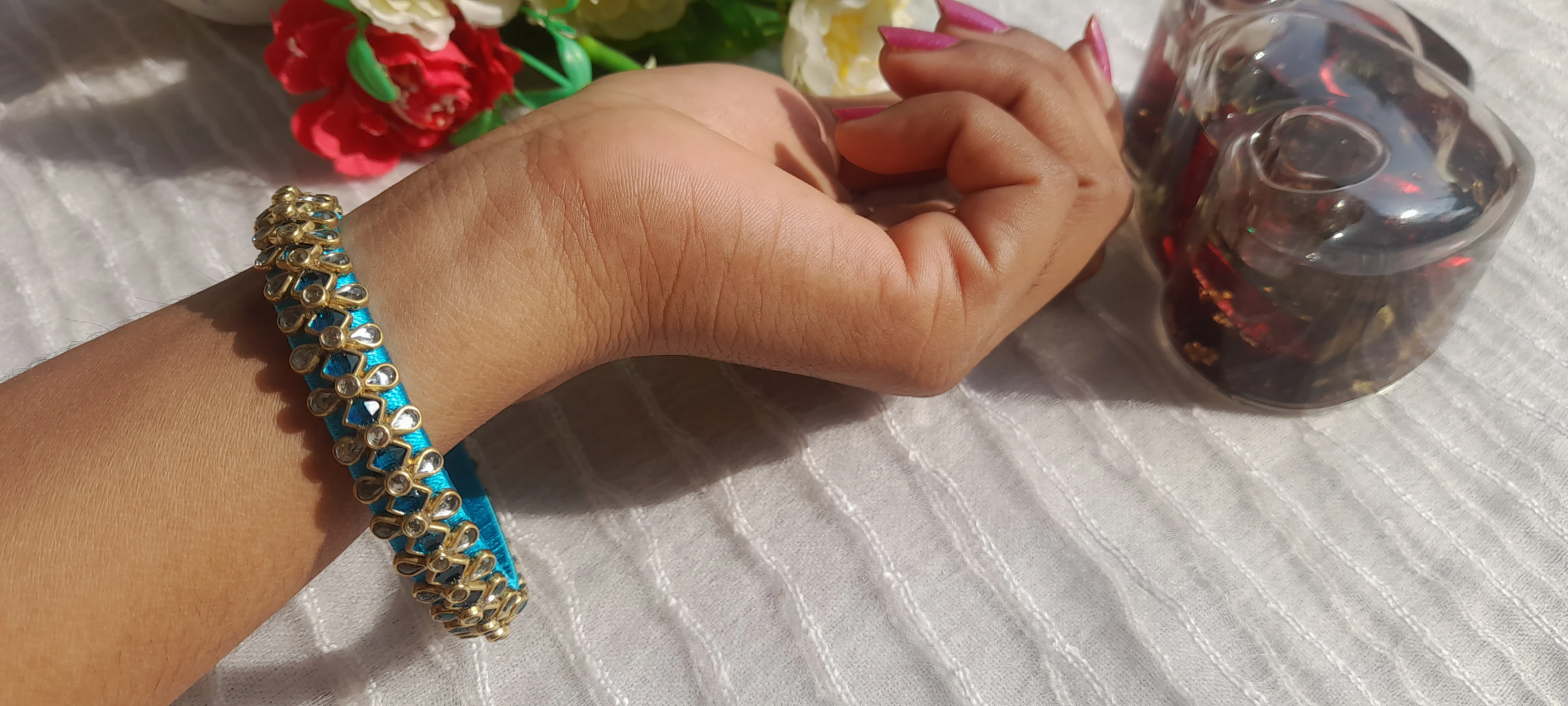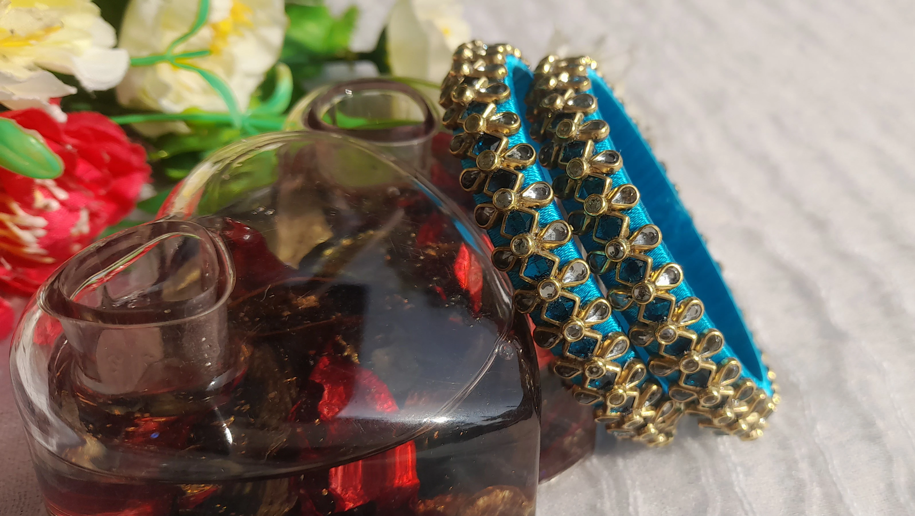 Grace your wrists with these handcrafted silk thread bangles in a rich turquoise blue shade, beautifully highlighted with antique gold finish embellishments and sparkling stone accents.perfect for festive wear, weddings, poojas, and ethnic celebrations. Lightweight, classy, and designed to elevate any traditional outfit effortlessly.