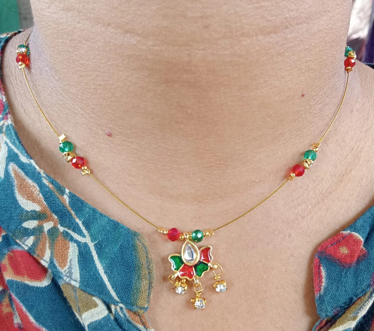 Add a regal touch to your look with this stunning multi-layered necklace set. Designed with six elegant strands of green emerald-like beads, each strand is adorned with golden Kundan teardrop charms that create a luxurious and traditional appeal. The set comes with matching floral Kundan earrings, making it perfect for weddings, festive occasions, and special celebrations. Lightweight yet classy, this statement jewelry piece enhances both ethnic and Indo-western outfits.